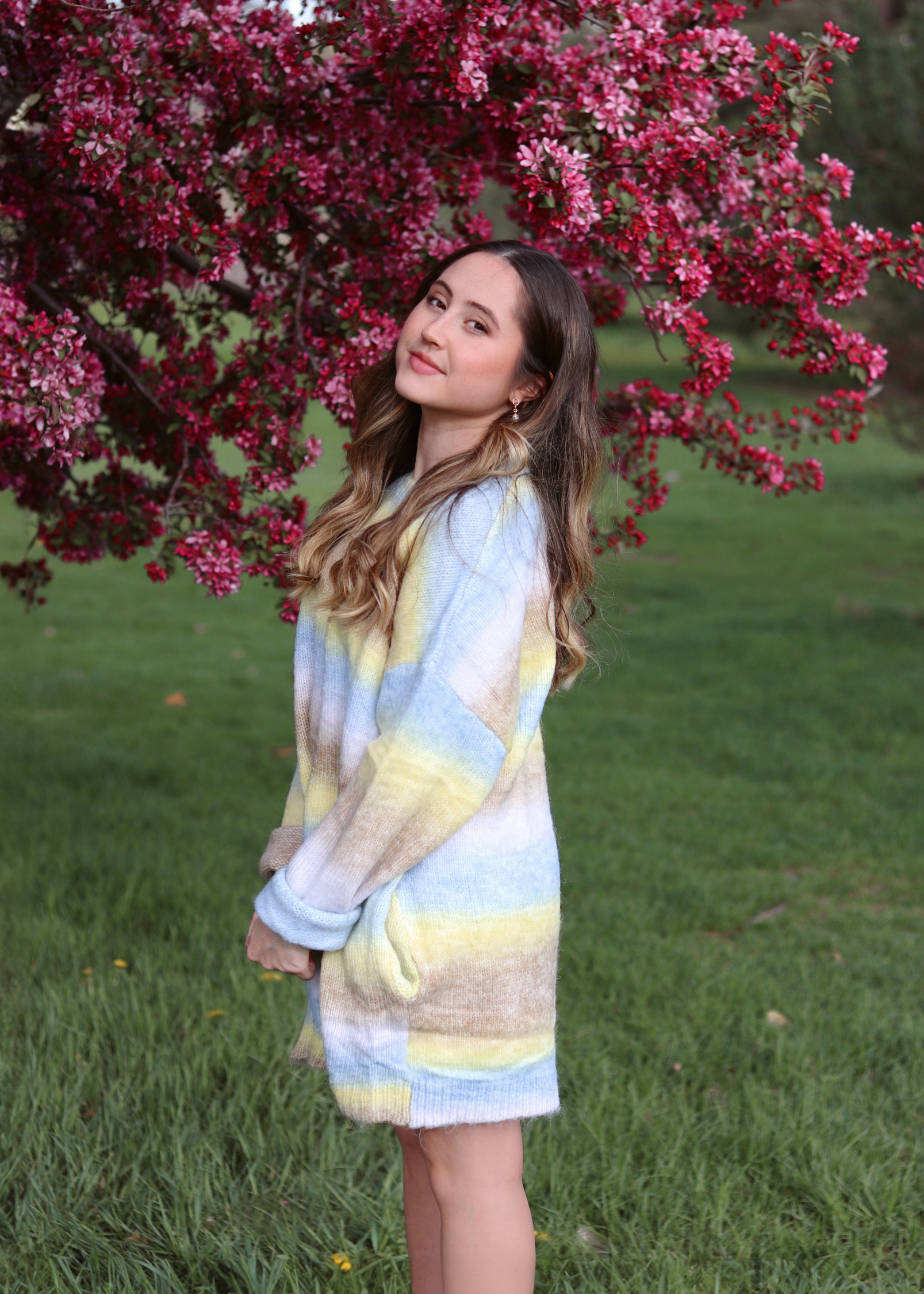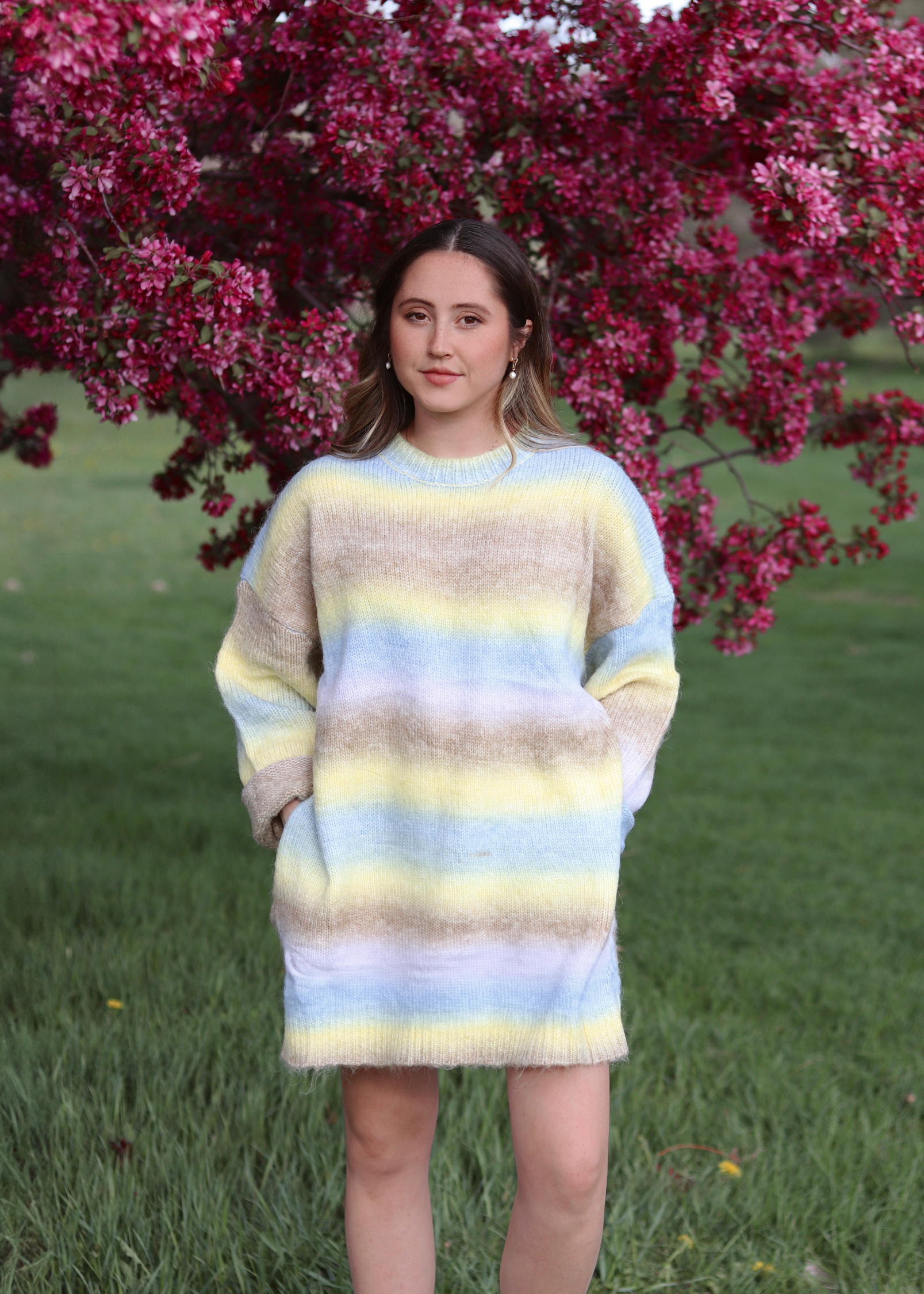 Meet the Striped Sweater Dress — your cozy-chic answer to cold-weather styling. Featuring a boxy, relaxed fit with pastel-toned stripes in yellow, baby blue, lavender, and soft brown, this unique color combo makes it as fun as it is versatile. Designed with side pockets and the softest knit, it’s perfect for lounging at home, layering over jeans, or belting up for a comfy-meets-cute dinner look.