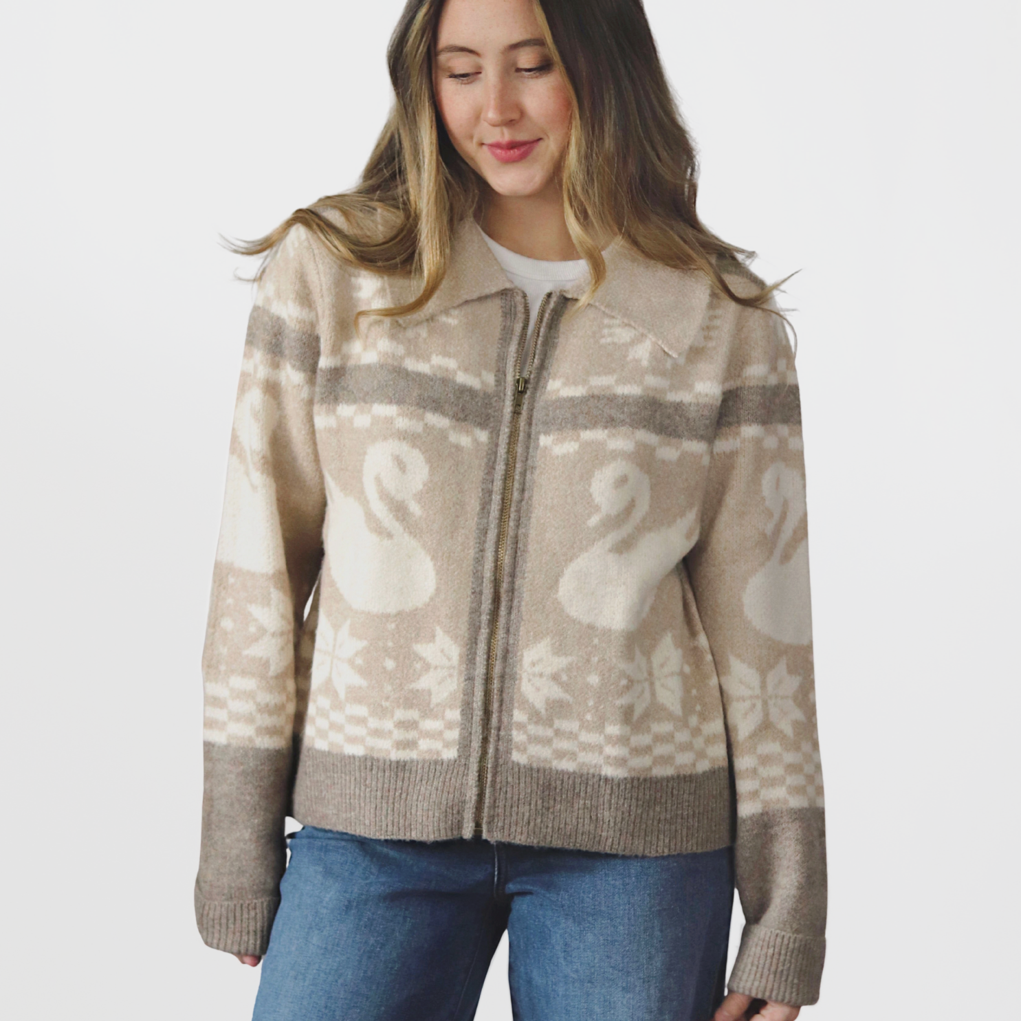 Cozy up in style with our Swan Lake Zip Up Sweater. Featuring soft knit fabric, a delicate swan motif, and gold-toned zipper hardware, this piece blends comfort with whimsical charm. Pair it with jeans or layer it over a skirt for an effortlessly chic winter look